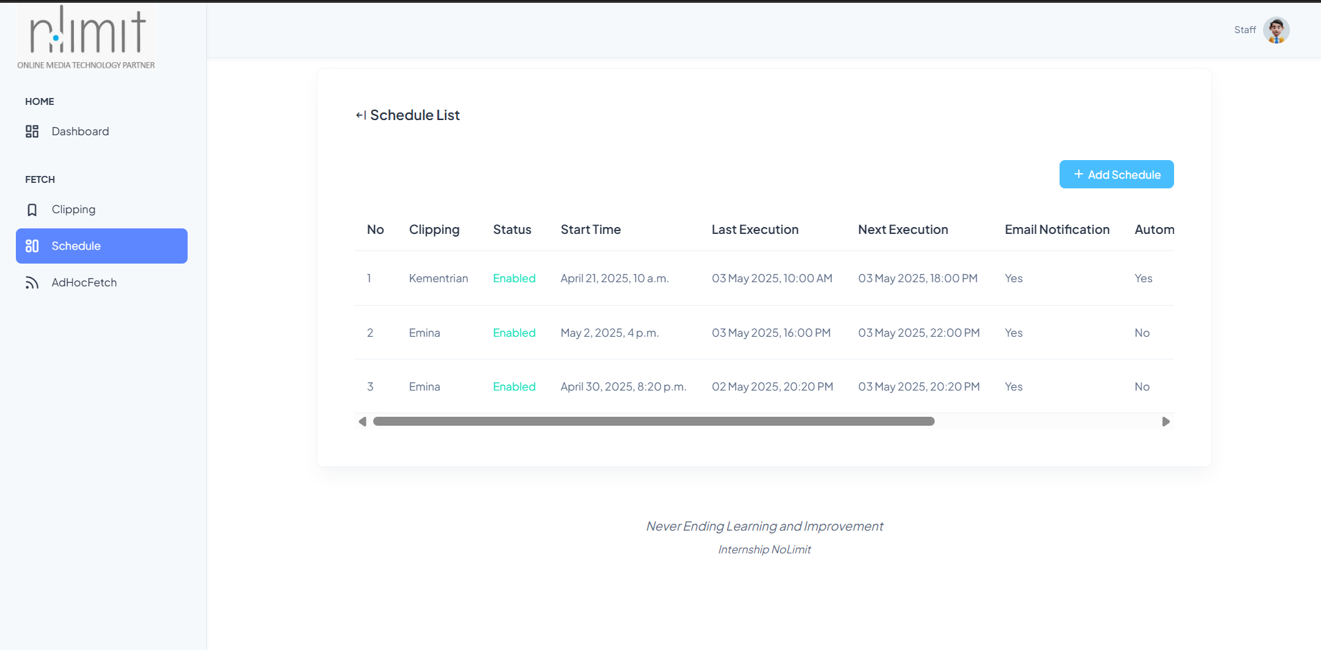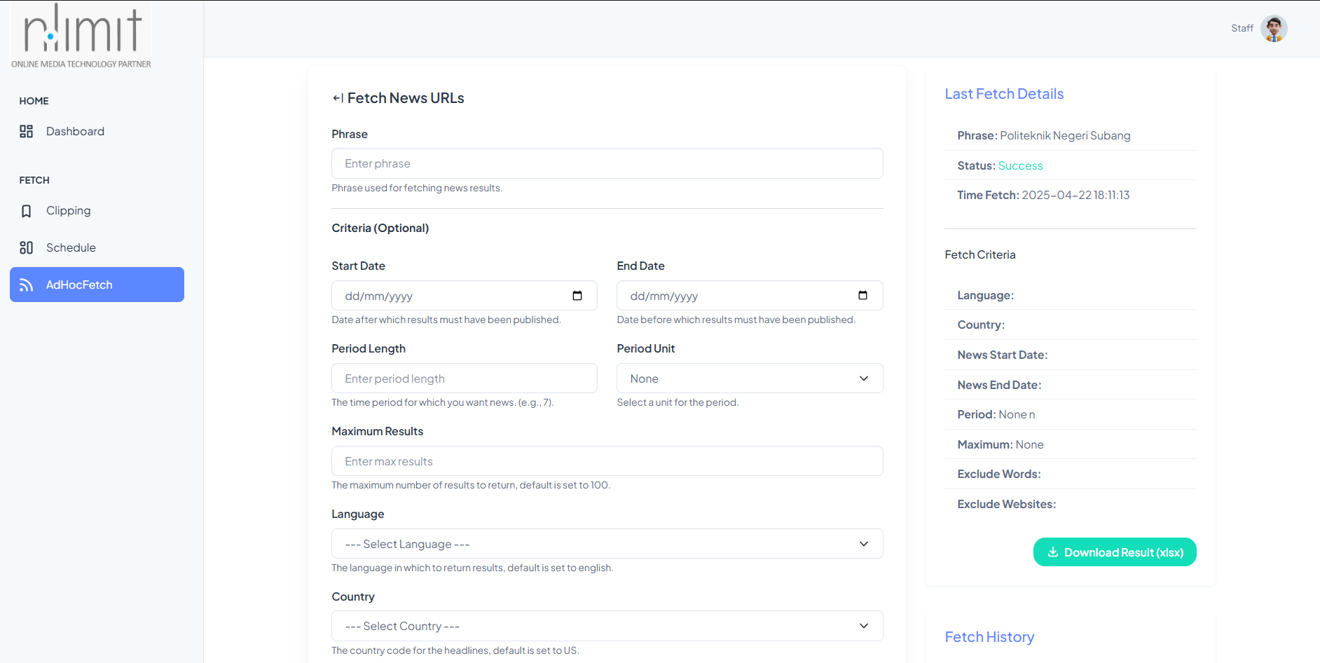 This system automates the retrieval and management of news articles using Google News RSS feeds. It features two user roles: Admin and Staff. Admins are responsible for creating and managing Projects, while Staff members input Clippings—each containing specific keywords or phrases related to the project. Key features include: Automated and ad-hoc news fetching based on clipping keywords. Scheduled retrieval of news articles per clipping. Exported results are automatically saved in Excel format for each retrieval session. Organized data management by project for efficient tracking. Built using the Django web framework, this system streamlines the media monitoring process, making it easier to collect, archive, and analyze relevant news coverage.